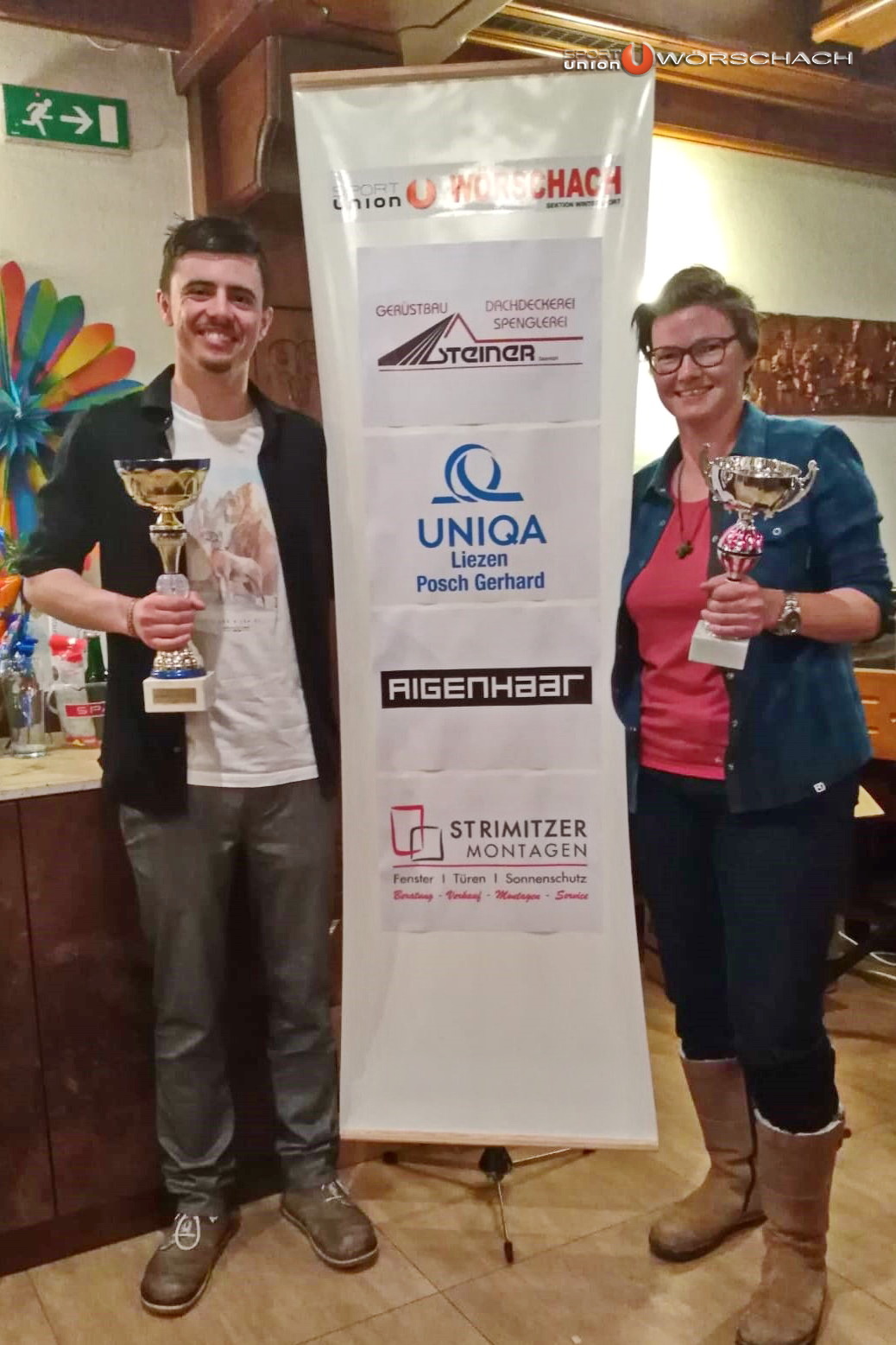 Nach spannenden Kämpfen um die Stockerlplätze standen schließlich die Sieger fest. Bei den weiblichen Teilnehmerinnen konnte, die in der AK I startende Cornelia Hüttinger den Titel der Vereinsmeisterin erringen. Vereinsmeister bei den Herren wurde zum vierten Mal in Folge Tobias Kerschbaumer - Allgemeine Klasse Herren.Bei der anschließend im Gasthaus Poschenhof der Fam. Schwaiger-Lemmerer in Wörschach abgehaltenen Abschlussveranstaltung bedankte sich anfangs der Sektionsleiter Wintersport Wolfgang Neuper bei seinem Team für die hervorragende Organisation und Abwicklung der Schi-Vereinsmeisterschaften 2019. Als überaus erfreulich hob er auch die hohe Beteiligung von Kindern sowohl bei den Vereinsmitgliedern wie auch in den Gästeklassen hervor. Weiters bedankte er sich auch bei den zahlreichen Sponsoren und der Familie Sölkner als Betreiber des Grafenwiesenliftes für die großartige Unterstützung. Bei der nachfolgend in Vertretung des Bürgermeisters Ing Franz Lemmerer von Vizebürgermeister Peter Stadler, sowie Sektionsleiter Wolfgang Neuper und seinem Stellvertreter Mario Reimer vorgenommenen Siegerehrung wurden an die Sieger und Platzierten schöne Ehrenpreise überreicht. Als Höhepunkt der anschließenden großen Sachpreisverlosung unter allen Teilnehmern konnten an Julian Richter aus Stainach und Wolfgang Kerschbaumer aus Wörschach je ein Paar hochwertige Schier ausgefolgt werden.